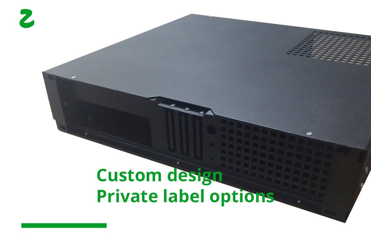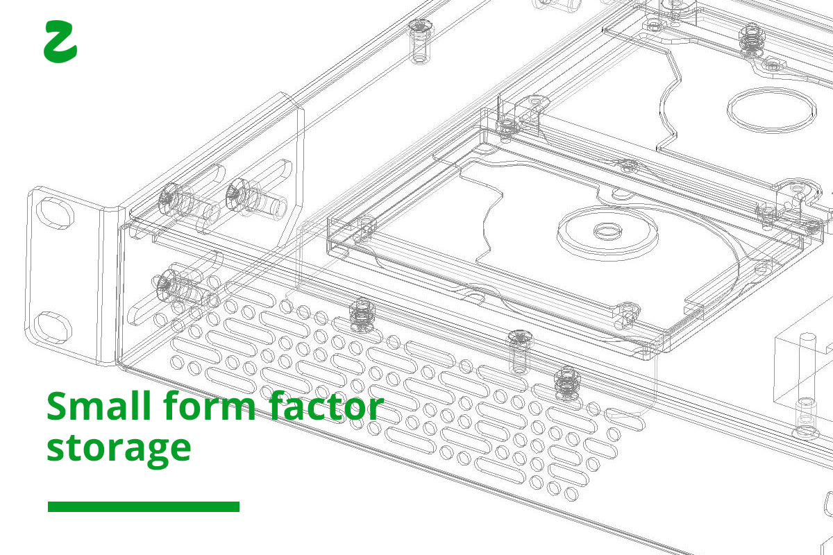Zozuu rack servers are based on Mini-ITX boards and designed for light processing tasks like webhosting, application servers, network servers and definitely SOHO NAS systems. We target the server market where extremely low power and 100% server up-time is of up most importance Configurable with up to 32 GB of DDR3 RAM memory chips and 1 processor soldered on the motherboard. The case has HDD brackets which fits 2x small factor drives (2.5") or 1x SATA drive (3.5"). We strongly recommend to use SSD drives showing remarkable performance and the industry standard for now.